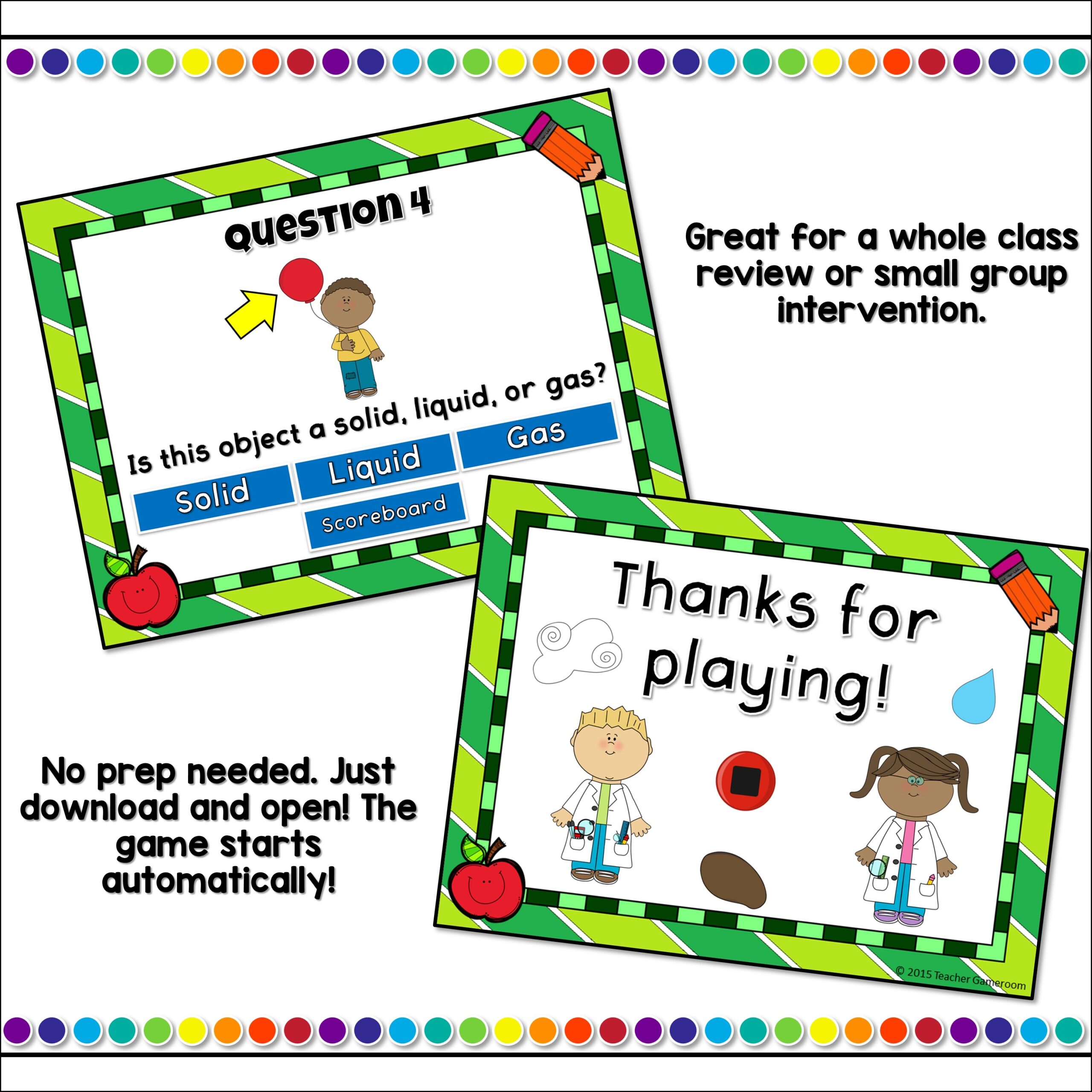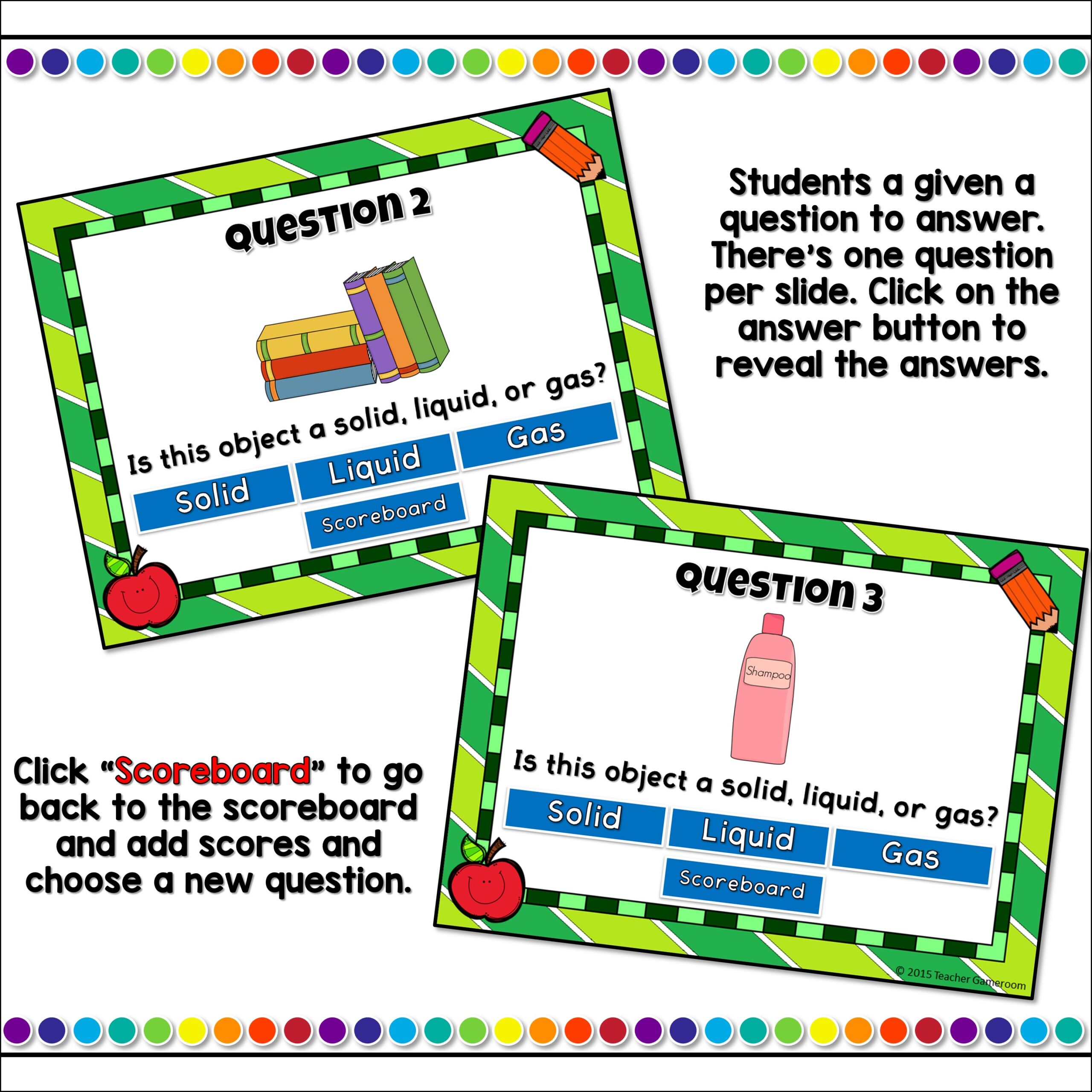 Students play in teams as they must determine whether every day objects are a solid, liquid, or gas. There are 20 questions.