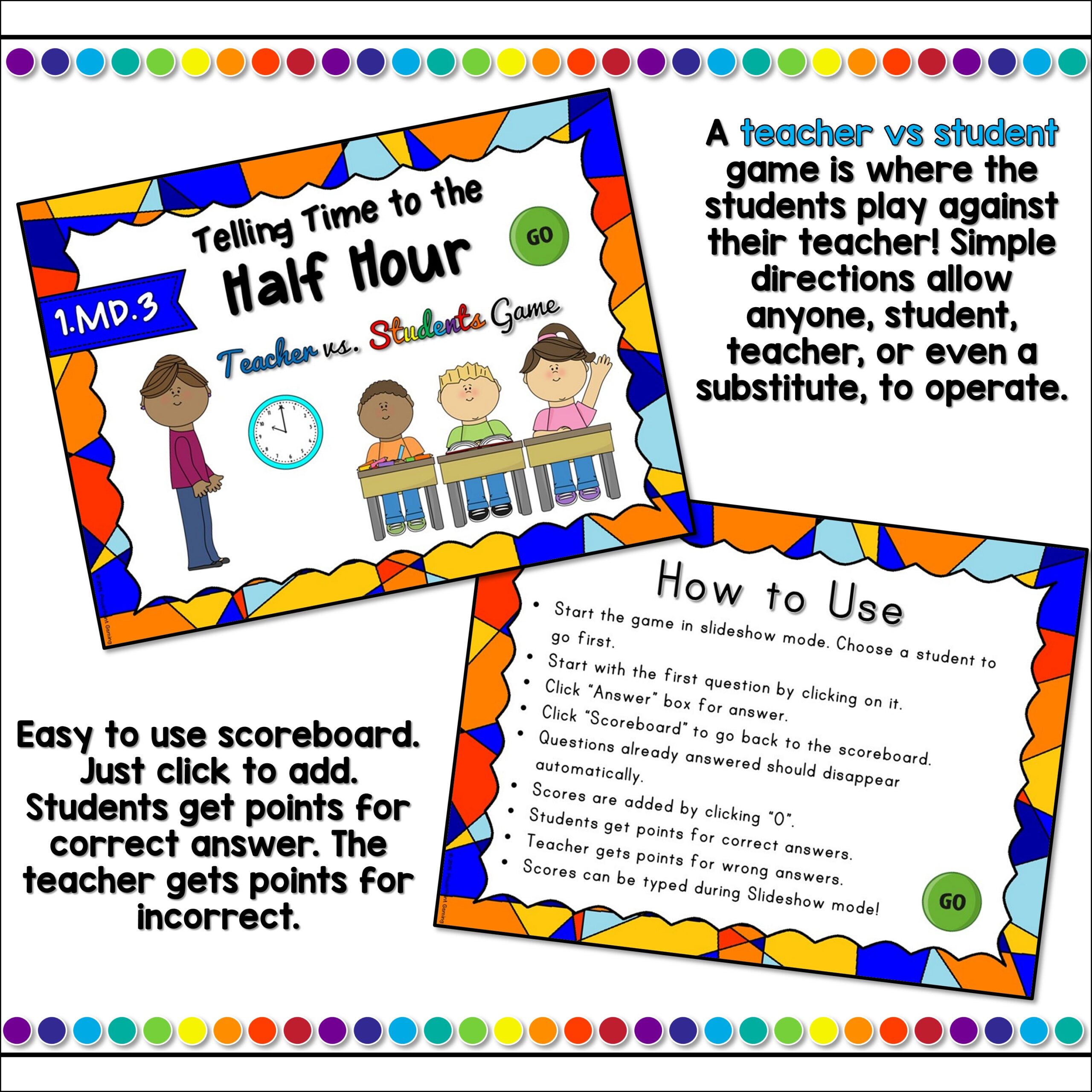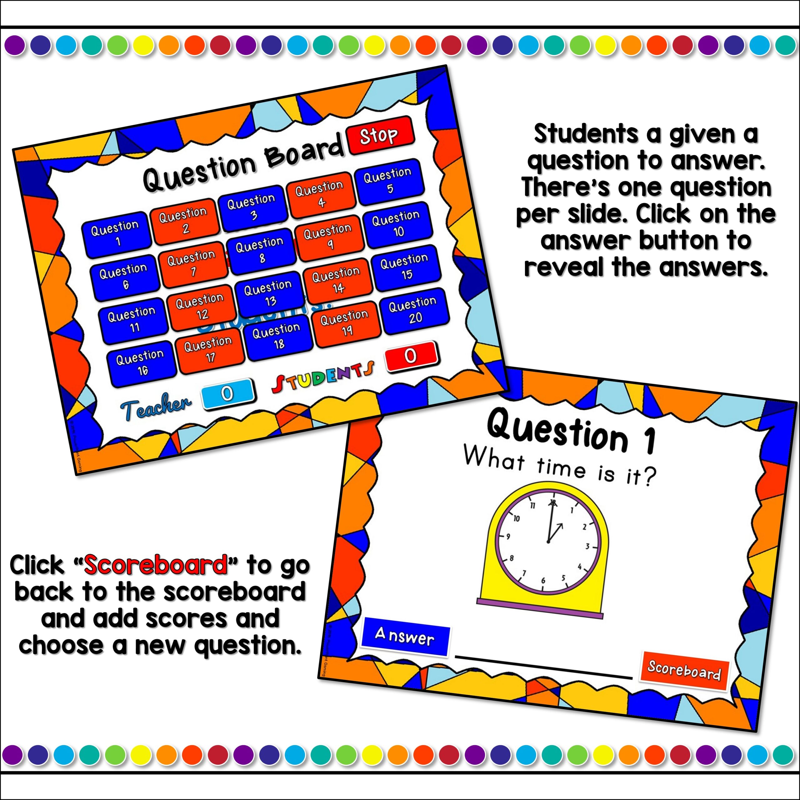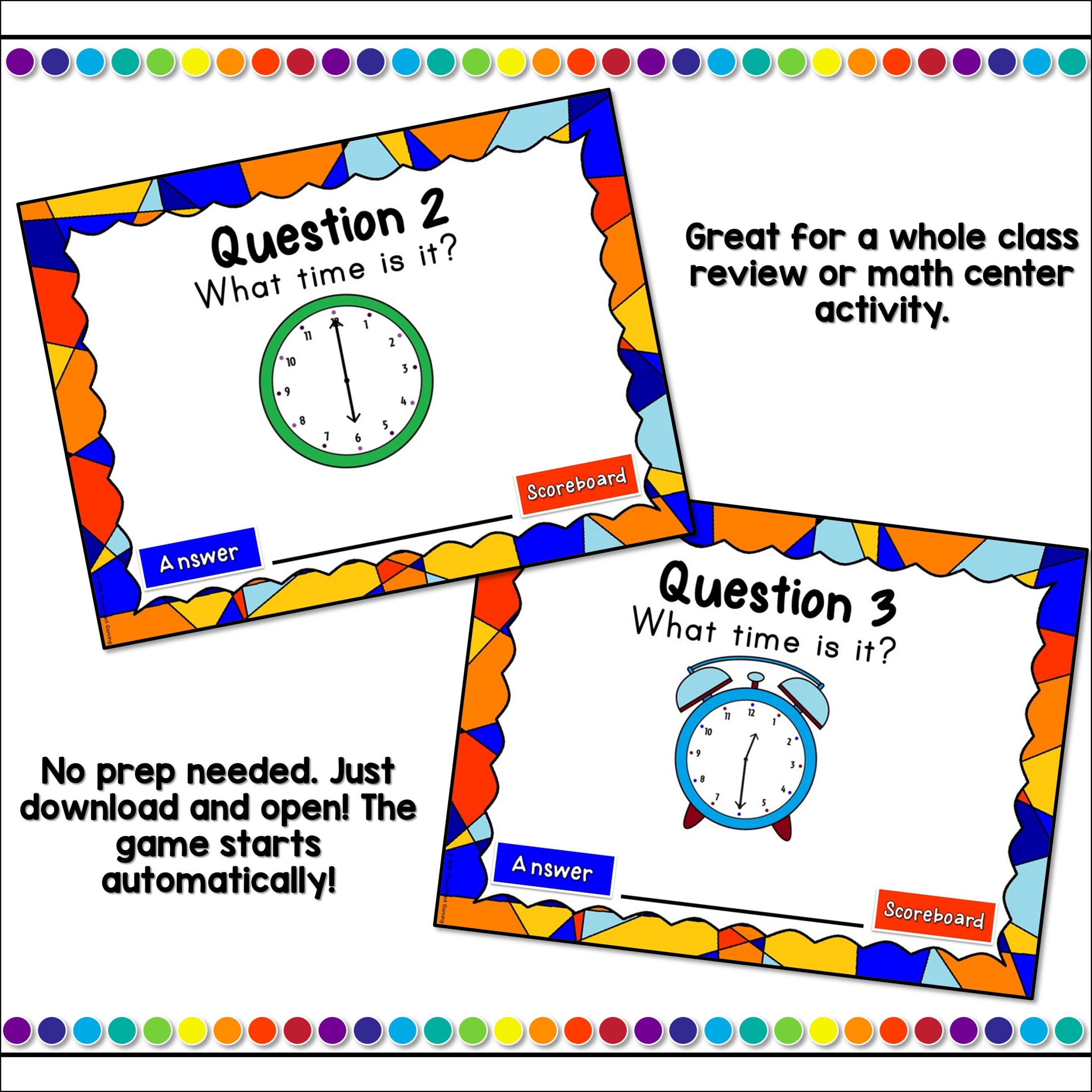 Students earn points against the teacher as they answer questions about telling time on analog clocks. Time is set to every five (5) minutes .
